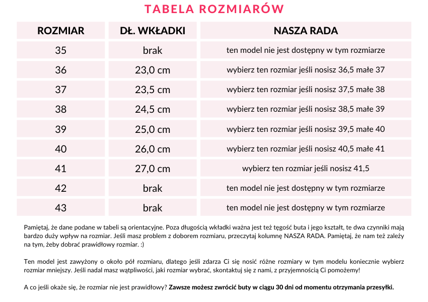 Buty wygl膮daj膮 ob艂臋dnie, s膮 te偶 bardzo porz膮dnie wykonane. Niestety, chocia偶 nosz臋 buty w rozmiarze 40 i zam贸wi艂am 40 , szpilki okaza艂y si臋 za ciasne w palcach. Mia艂am je odes艂a膰 i zam贸wi膰 wi臋ksze ale zauwa偶y艂a je c贸rka, stwierdzi艂a, 偶e s膮 cudne wi臋c sprezentowa艂am jej t臋 par臋.C贸rka normalnie nosi 39 i na ni膮 pasuj膮 idealnie.Zalety:Kolory , wykonanie, mi臋kka wk艂adkaWady:Dla mnie okaza艂y si臋 zbyt ciasne w palcach