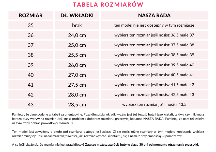 Buty s膮 pi臋kne. Sk贸ra mi臋kka. Jako艣膰 wykonania rewelacyjna. Dopiero je otrzyma艂am i tylko przymierzy艂am ale jestem przekonana, 偶e b臋d膮 bardzo wygodne. Pi臋kny kolor. Dostawa bardzo szybka.Zalety: